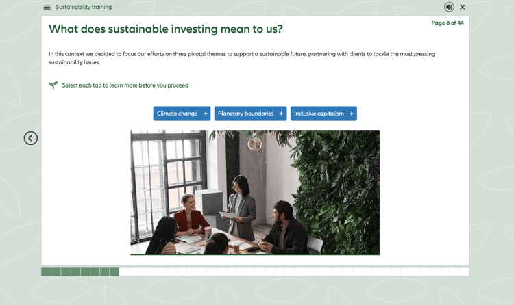 The course starts with a page with tiles that guides the user into different paths through the content. This enables learners to follow personalised paths through a course based on their role, prior knowledge, or choices made during the training.